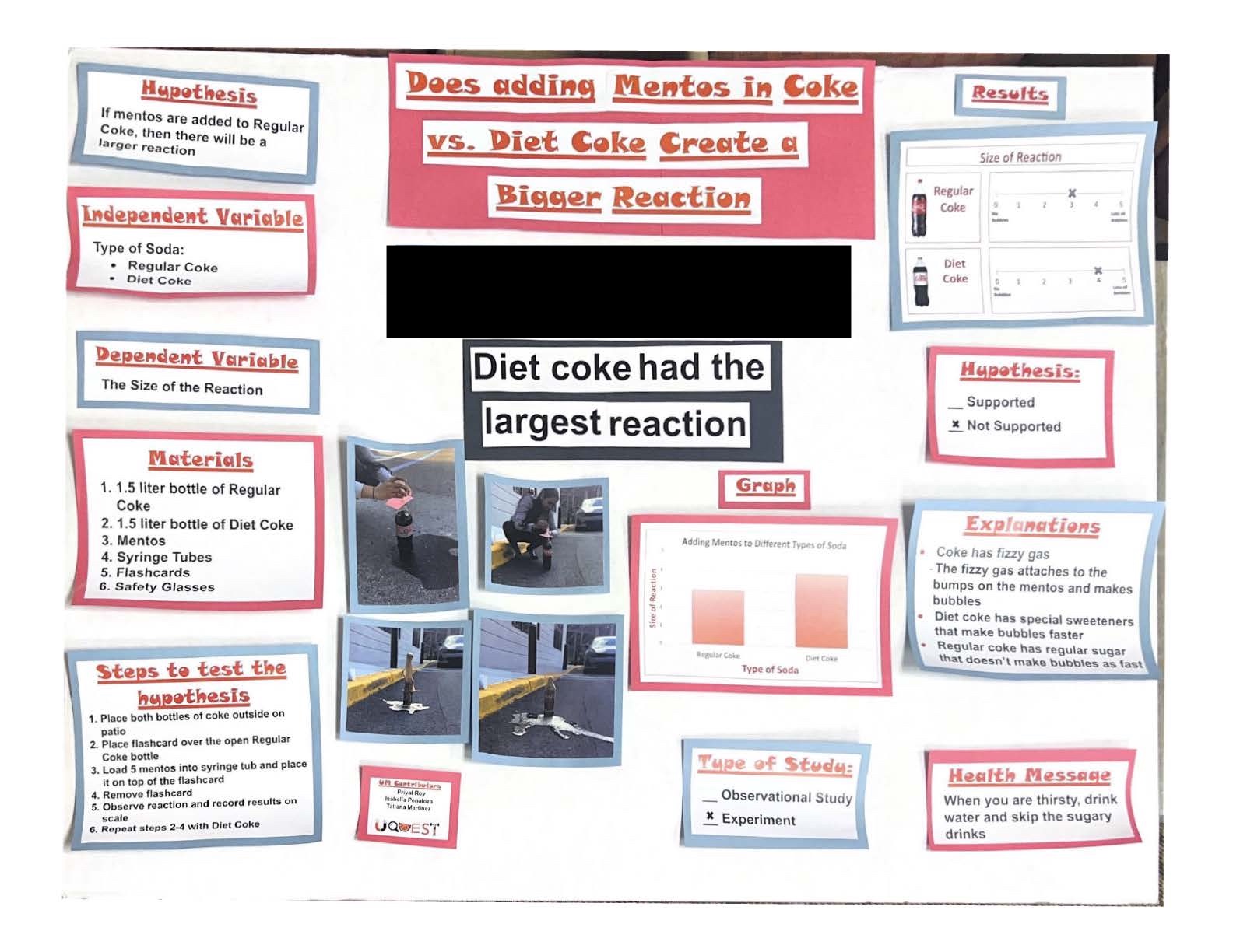- Week 3 - A science concept checklist was provided to help students reflect on the concepts they had used. Students assembled science fair boards using a template provided by their Guides (i.e., near peer mentors). Students rehearsed presenting their work to their Guides and their research group.